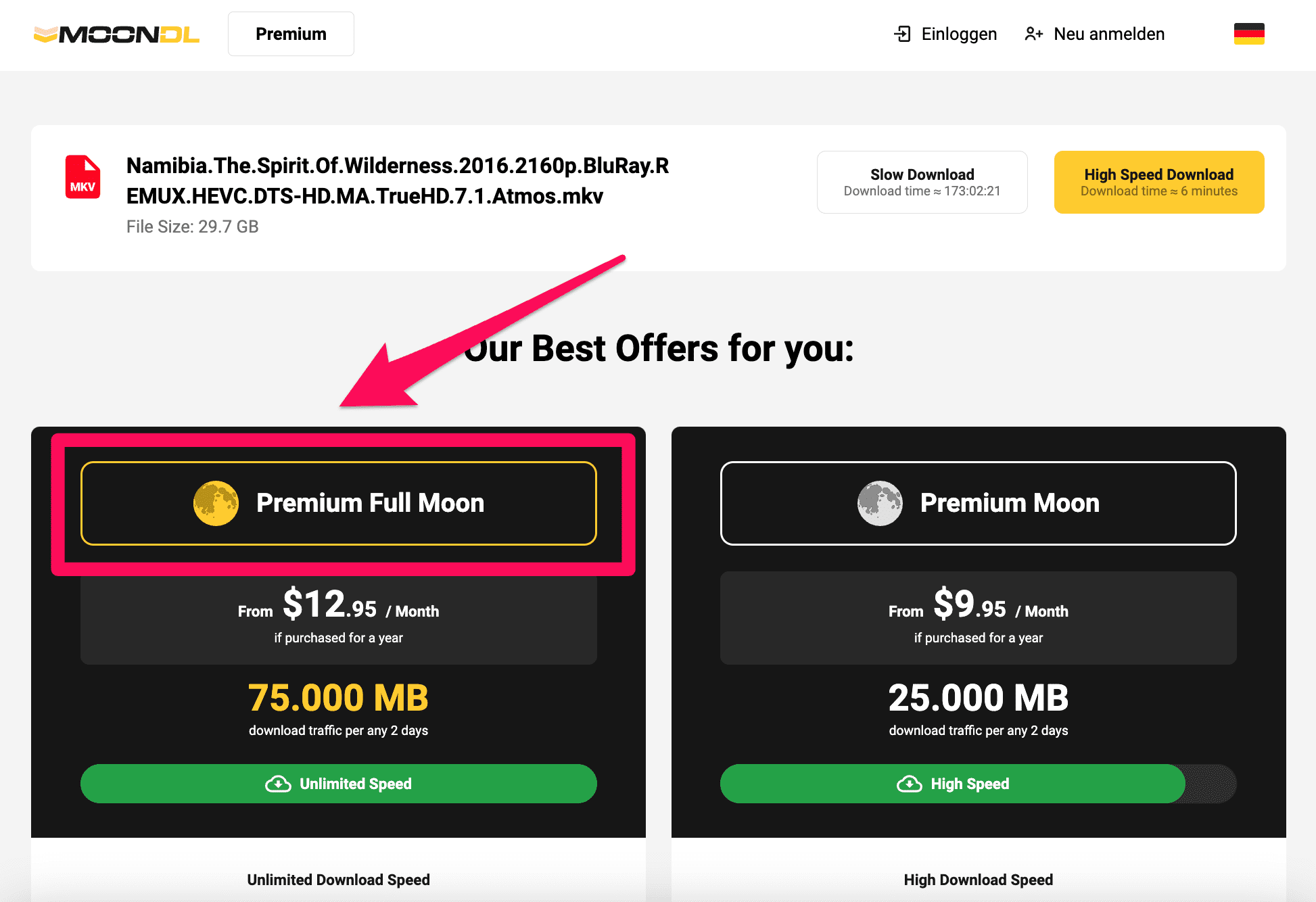 3. Wir sind bei MoonDL.com, wählen Sie den Premium-Typ "Premium Full Moon" (damit erhalten Sie alle 2 Tage zusätzliche 512gb Traffic).